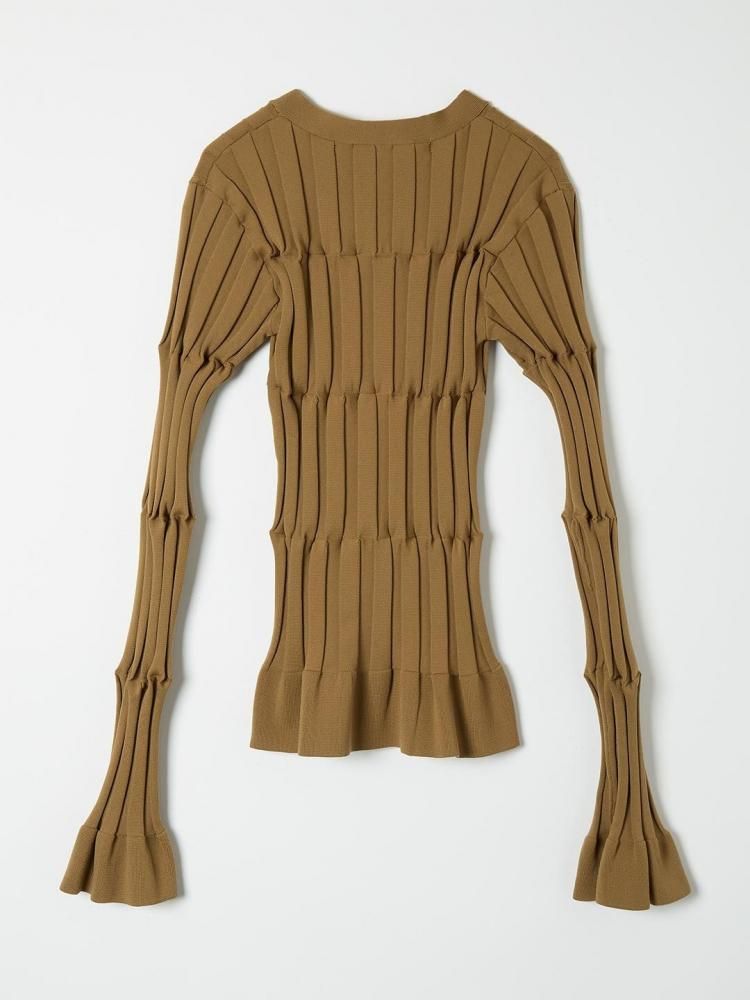 キュッと縮まるデザインを活かし、袖口と裾にはフリルのような広がりを加えています。