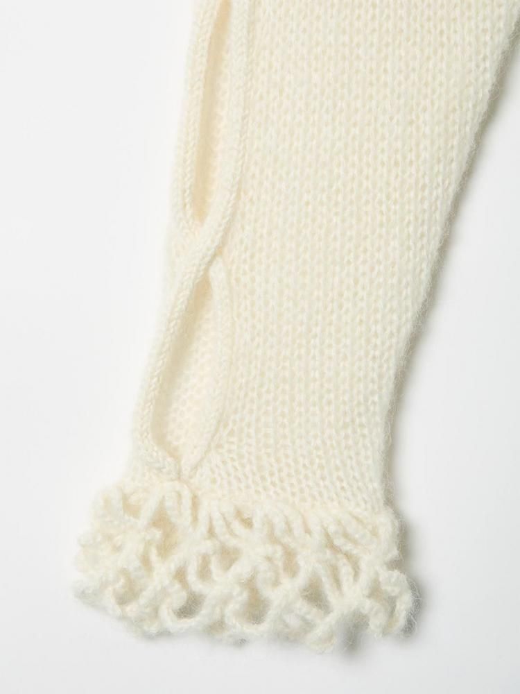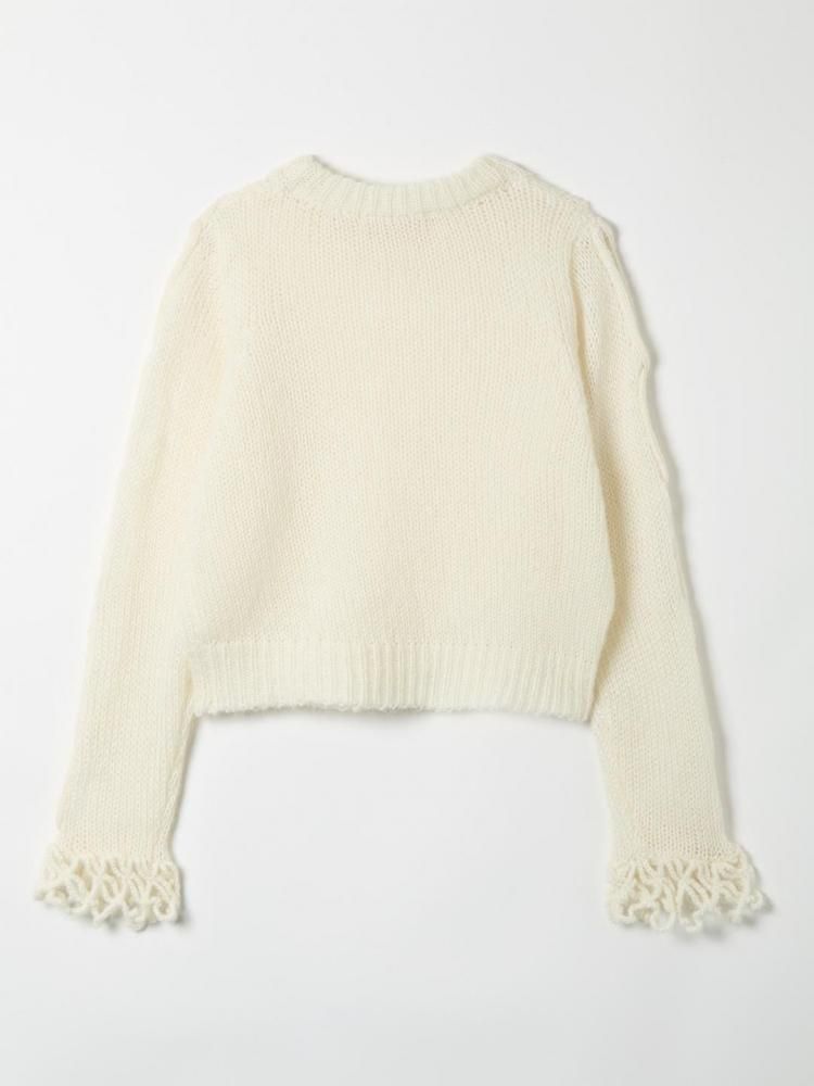 ケーブル編みの網目をたくみにくり抜いたデザインが特徴的なリラックスシルエットのモヘアニット。ドットメッシュの網と組み合わせ、裾と袖口にはネット状のフリンジをかぎ針であしらい、繊細でありながらも動きのあるデザインにしました。網目は袖にも施し、インナートップとのコーディネートも楽しめる一枚になっています。