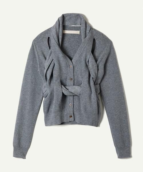 ミニマルなウールカーディガンに、スリットのアクセントを加え、同素材のマフラーをセットにしたプレイフルな一枚。単品でお使いいただくのはもちろん、スリットを活かし、マフラーを巻き付けるようなスタイリングも素敵です。浅めのVネックでデコルテをスッキリ美しく見せてくれるデザインです。